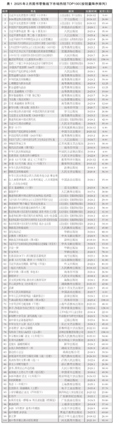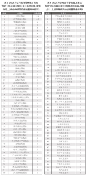综合图书零售线下、线上市场两个热销TOP100,按出版社上榜书频次排列:人民出版社以12.5种(次)列第1位;高等教育出版社以11.5种(次)列第2位;人民文学出版社、江苏凤凰文艺出版社分别以10种(次),并列第3位。