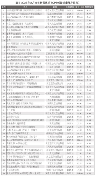 2月份,以《小鸟啃坏玫瑰还说人类脾气太暴躁  小狗疑心大宇宙阴谋篡夺它的位置》为领衔的当年新书,表现非凡。特别是当月出版上市的最新品,有46个品种晋入当年新书热销TOP50(见表5),占比逾9成。当年新书热销TOP50,分属35家出版社,同比增加5家,环比增加7家。其中,中央出版社17家,地方出版社18家。中国政法大学出版社以5个品种晋入,北京联合出版公司以4个品种晋入,江苏凤凰文艺出版社、人民邮电出版社分别以3个品种晋入,彰显了各自开年新书广为读者青睐。